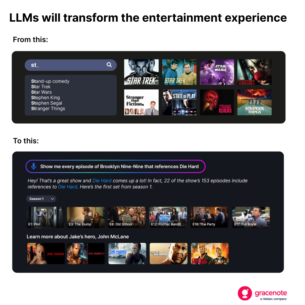 As companies embrace generative AI systems such as large language models (LLMs1) for the efficiencies they can deliver, an array of legacy technologies will become increasingly obsolete. In TV, LLMs will augment–and eventually replace–traditional databases and rudimentary search functions. Over time, they will become the default engines for delivering next-generation entertainment experiences.